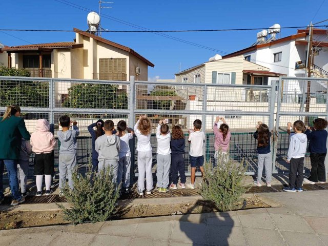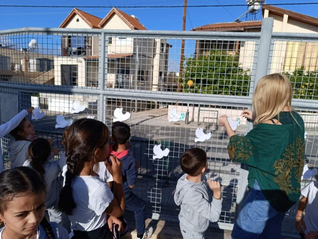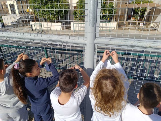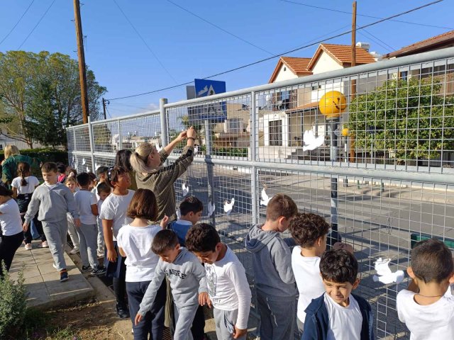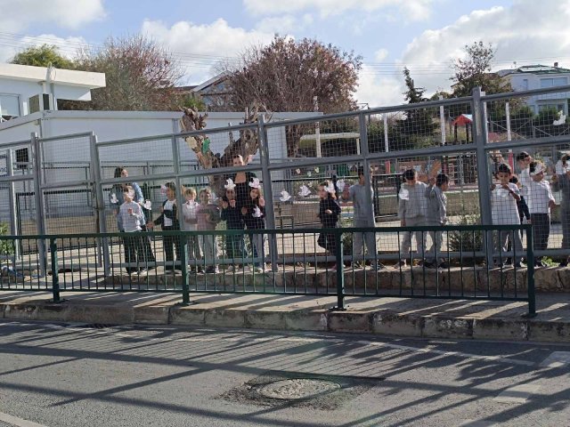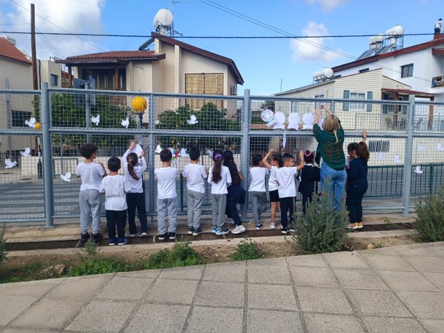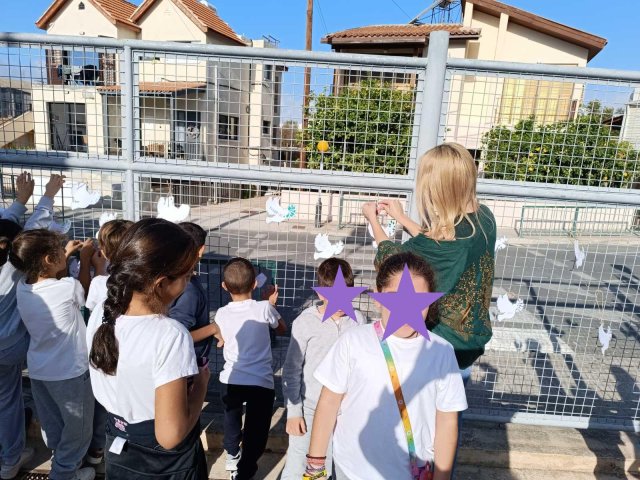 Τα παιδιά της Β' τάξης κρέμμασαν χάρτινα περιστέρια στα κάγκελα της εισόδου θέλοντας να δείξουν την επιθυμία μας για ειρήνη!